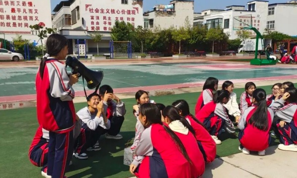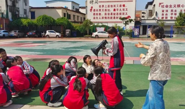 活动伊始,“桃花朵朵开”热身游戏迅速点燃现场气氛。全体学生手拉手围成圆圈,随着老师“桃花朵朵开”的指令,大家根据报出的数字快速抱团。落单的同学通过简短的自我介绍,逐渐消除了彼此间的陌生感。轻松的互动让操场成为充满活力的乐园,为后续团队合作奠定了良好基础。