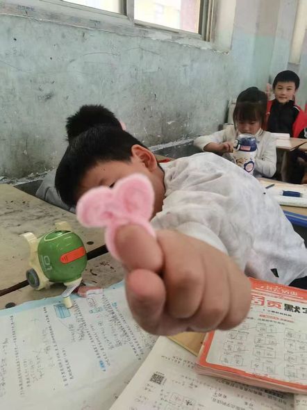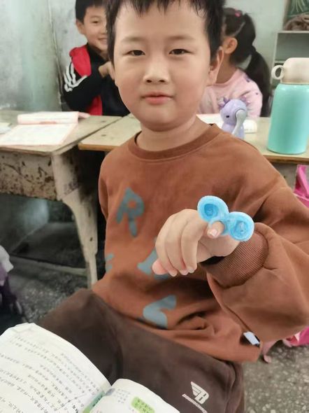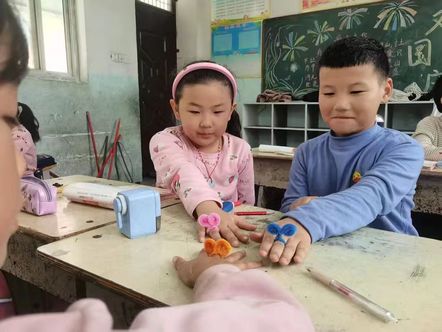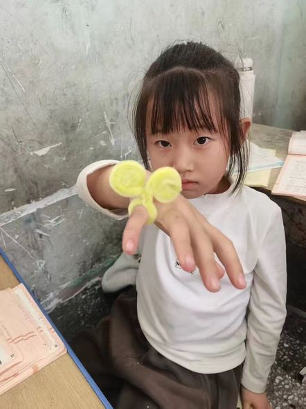 社团教室里,小朋友们正在专注地做手工戒指。一根根扭扭棒在他们灵活的手指中变成了一个个五颜六色的戒指。