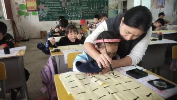 老师躬下身子手把手的教孩子们握笔,运笔,转腕……