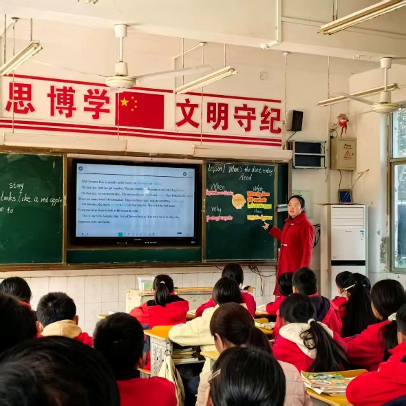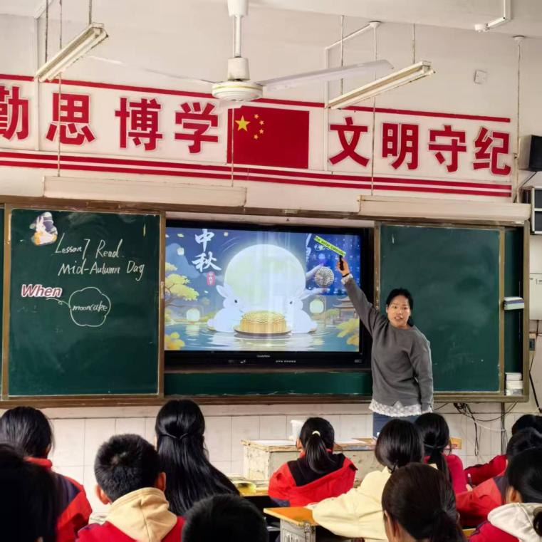 胡瑞萍、李艳老师共同讲授六年级英语《Mid-Autumn Day》,全英的教学模式,让农村的孩子打开了眼界,课堂生动有趣的游戏深深吸引着他们。