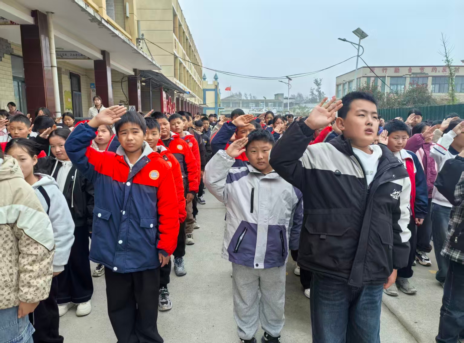 伴随着激昂雄壮的《义勇军进行曲》,五星红旗冉冉升起,全体师生肃立敬礼。目光追随着飘扬的国旗,爱国情怀与安全意识在每个人心中悄然扎根。