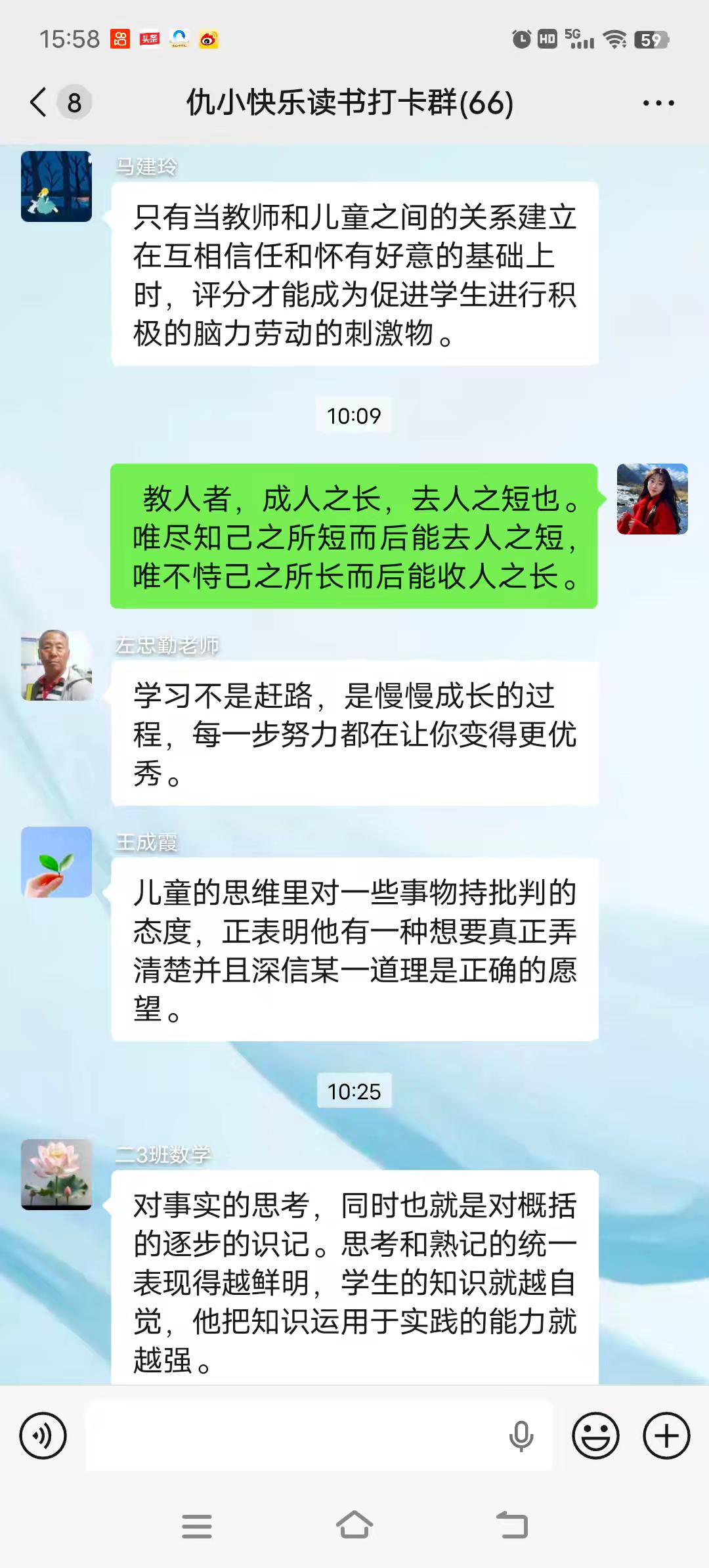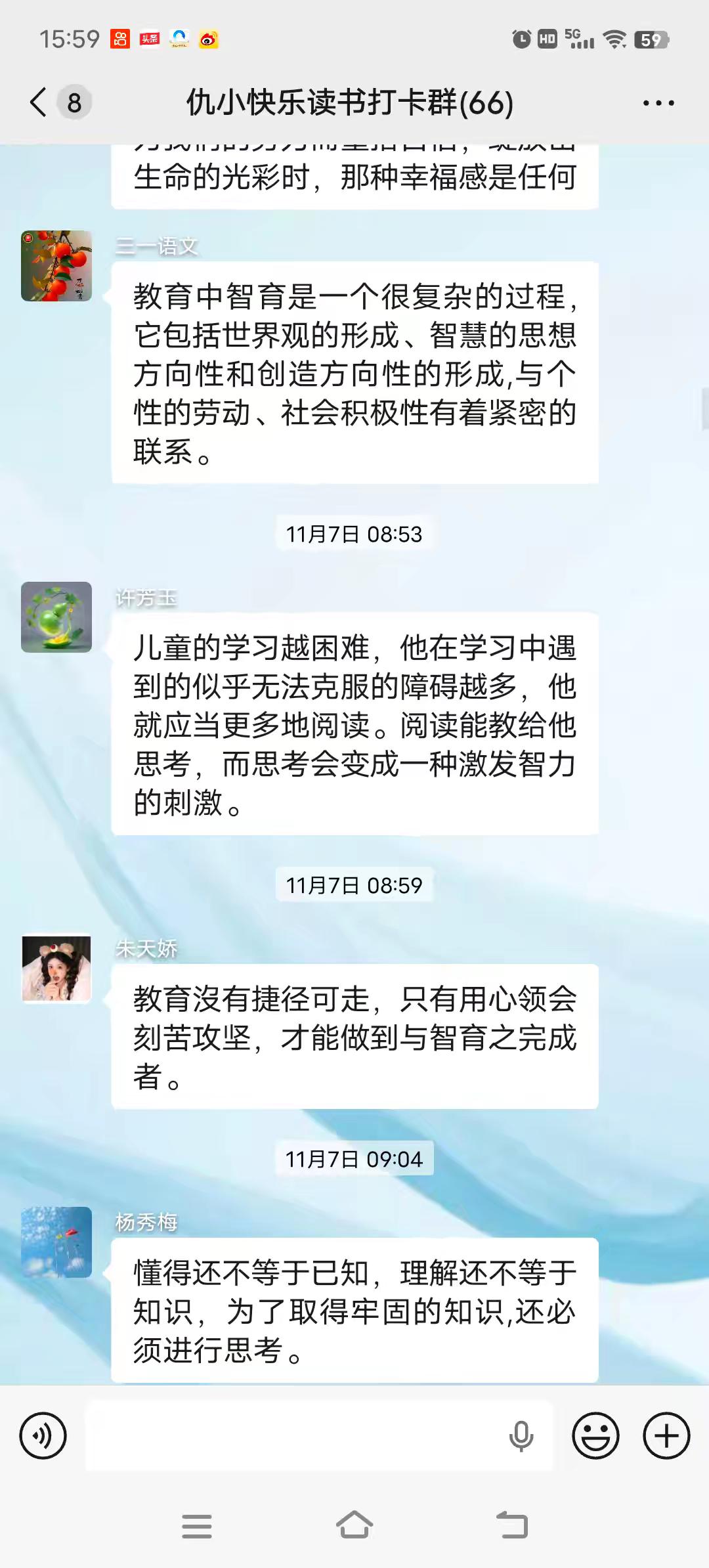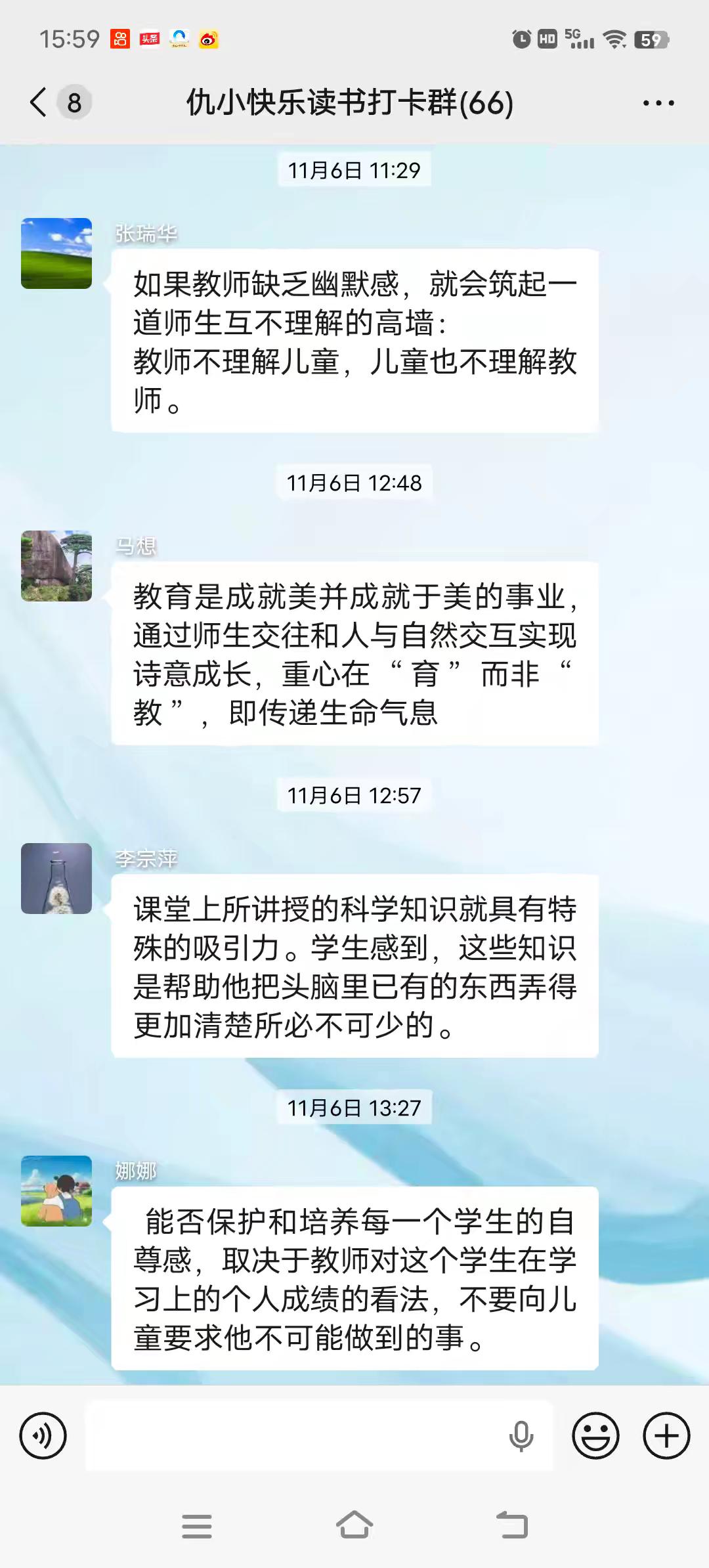 “一日一箴言,一思一成长。”每日读书感悟打卡成为教师们的“必修课”。大家循着书中章节循序渐进,将触动内心的教育箴言、实用建议摘录下来,结合日常教学场景写下简短感悟。“教育的本质是心灵唤醒心灵,而非简单的知识灌输”“对待后进生,要善于发现他们的闪光点,用耐心点燃希望”……一句句精炼的摘录,一段段真挚的思考,通过校园读书群实时分享,让教育智慧在日常积累中不断沉淀,让教学反思成为一种习惯。