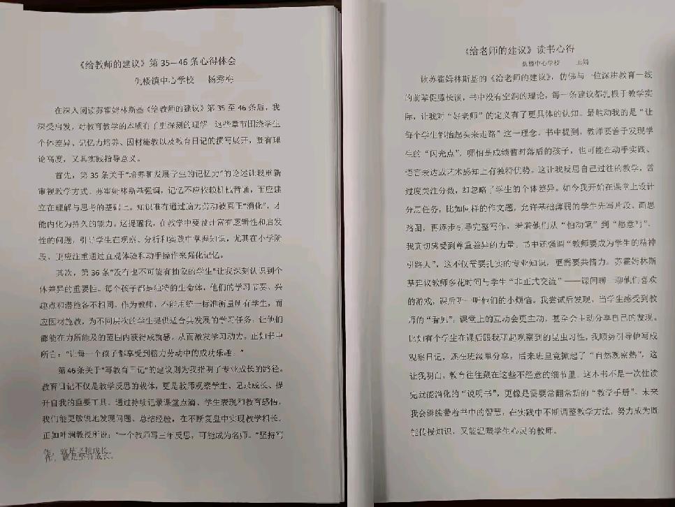 如果说每日打卡是智慧的碎片积累,每月一篇的心得体会便是理论与实践的深度融合。教师们围绕当月精读的章节,结合自己的课堂教学、班级管理、学生沟通等具体工作,梳理书中建议的实践应用场景。有的教师分享如何运用“分层教学”建议优化课堂设计,有的记录借鉴“家校沟通”技巧化解育人难题的过程,还有的反思自身教学中与经典理念的差距与改进方向。一篇篇心得体会,既是对教育名著的深度解读,更是教师专业成长的真实足迹。