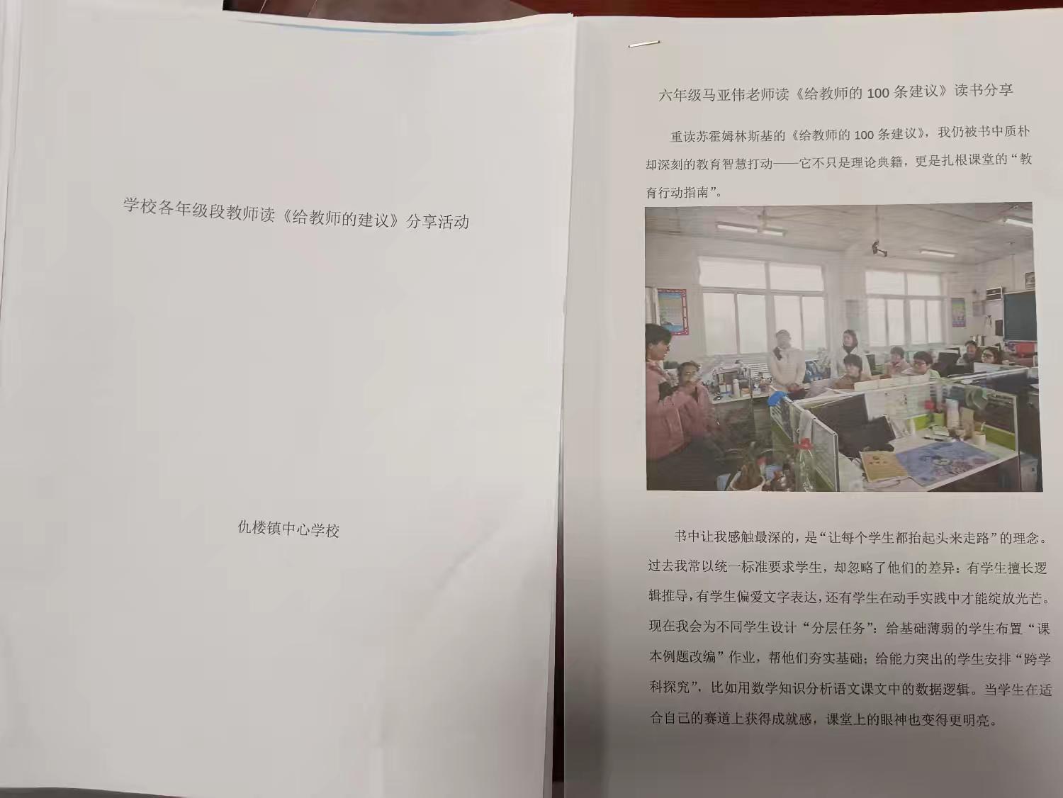 深耕教育书海,笃行育人之路。仇楼镇中心学校《给教师的100条建议》专题读书活动,不仅让教师们从经典著作中汲取了丰富的教育智慧,更搭建了交流分享、共同成长的平台。未来,学校将持续推进专题读书活动,让教育名著成为教师专业成长的“养分库”,让每一位教师都能在阅读中精进教学、在实践中提升素养,用智慧与爱心浇灌每一颗幼苗,为教育事业的发展注入持久动力!