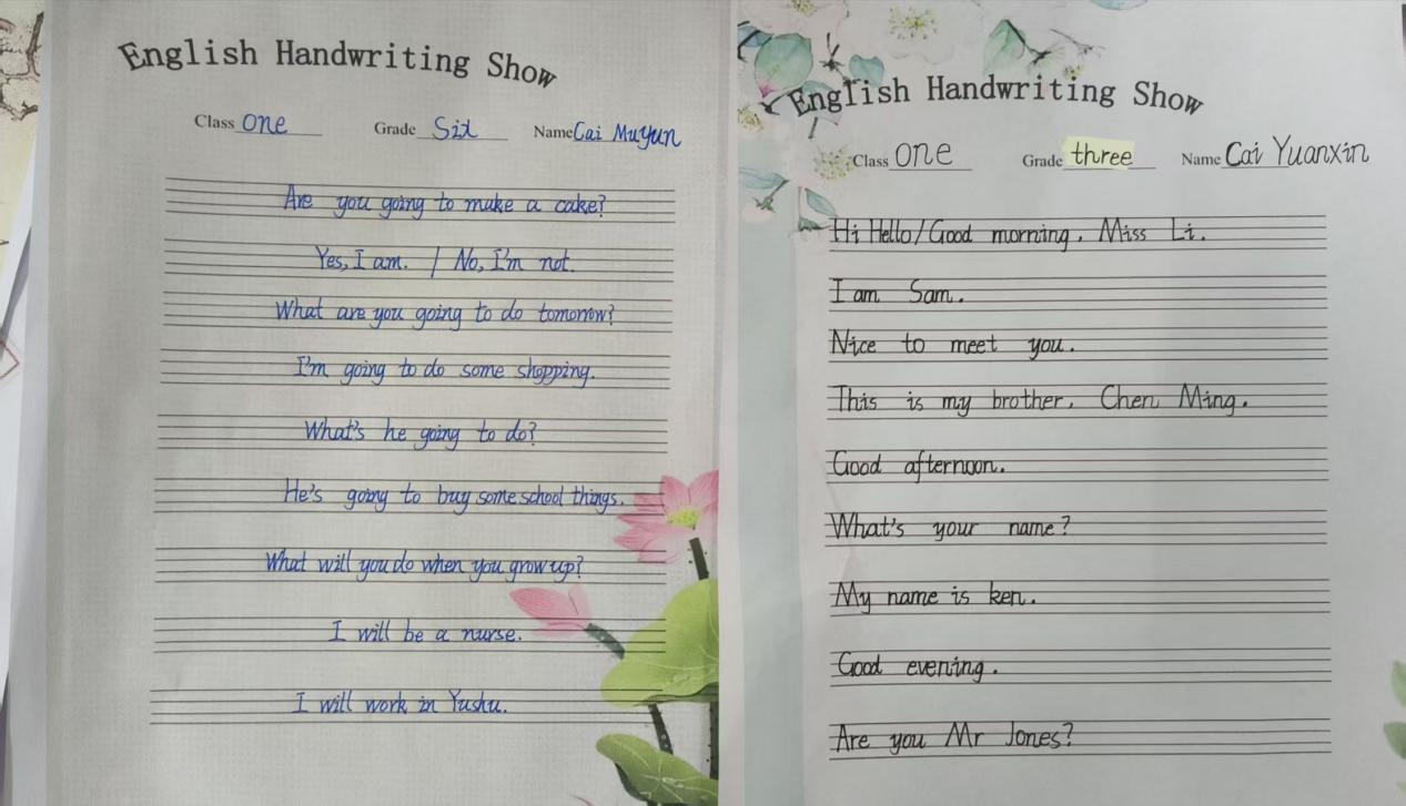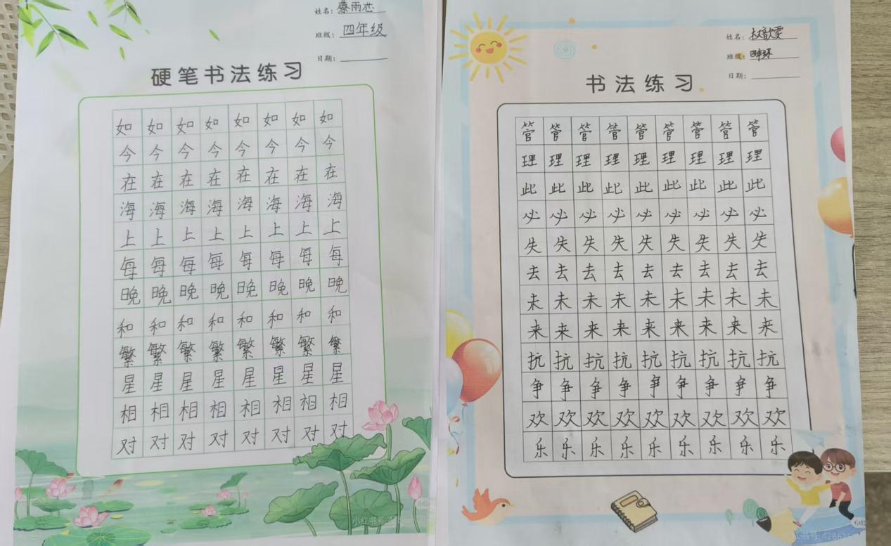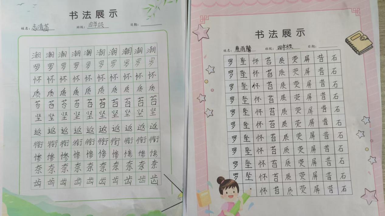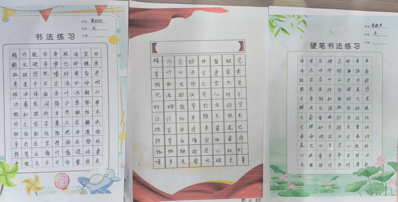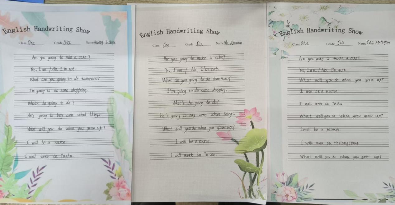 活动结束后,学生们的作品被整齐展示。英语书法作品使用装饰精美的展示纸,字母书写规范,搭配简单图案,显得活泼有趣。语文硬笔书法作品则字迹工整,笔画流畅,展现了扎实的书写基础。这些作品不仅体现了学生的努力,也反映了学校对书写教育的重视。