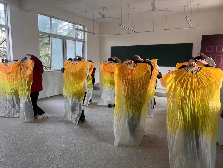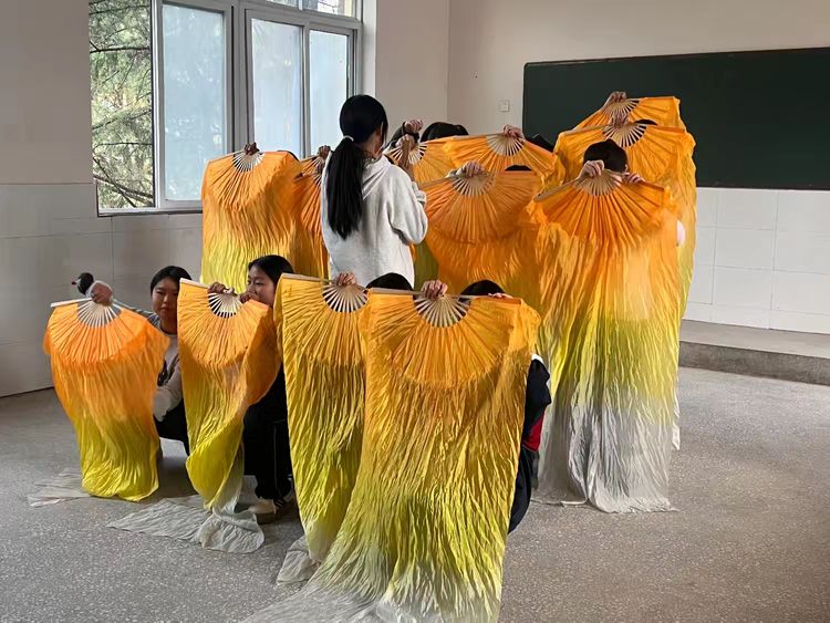 舞蹈社团的成员们在进行排练,同学们手持扇子,配合音乐的节奏起舞。渐变色的大扇在舞动中展现出优美的弧线,队员们的动作整齐划一,充满了表现力。