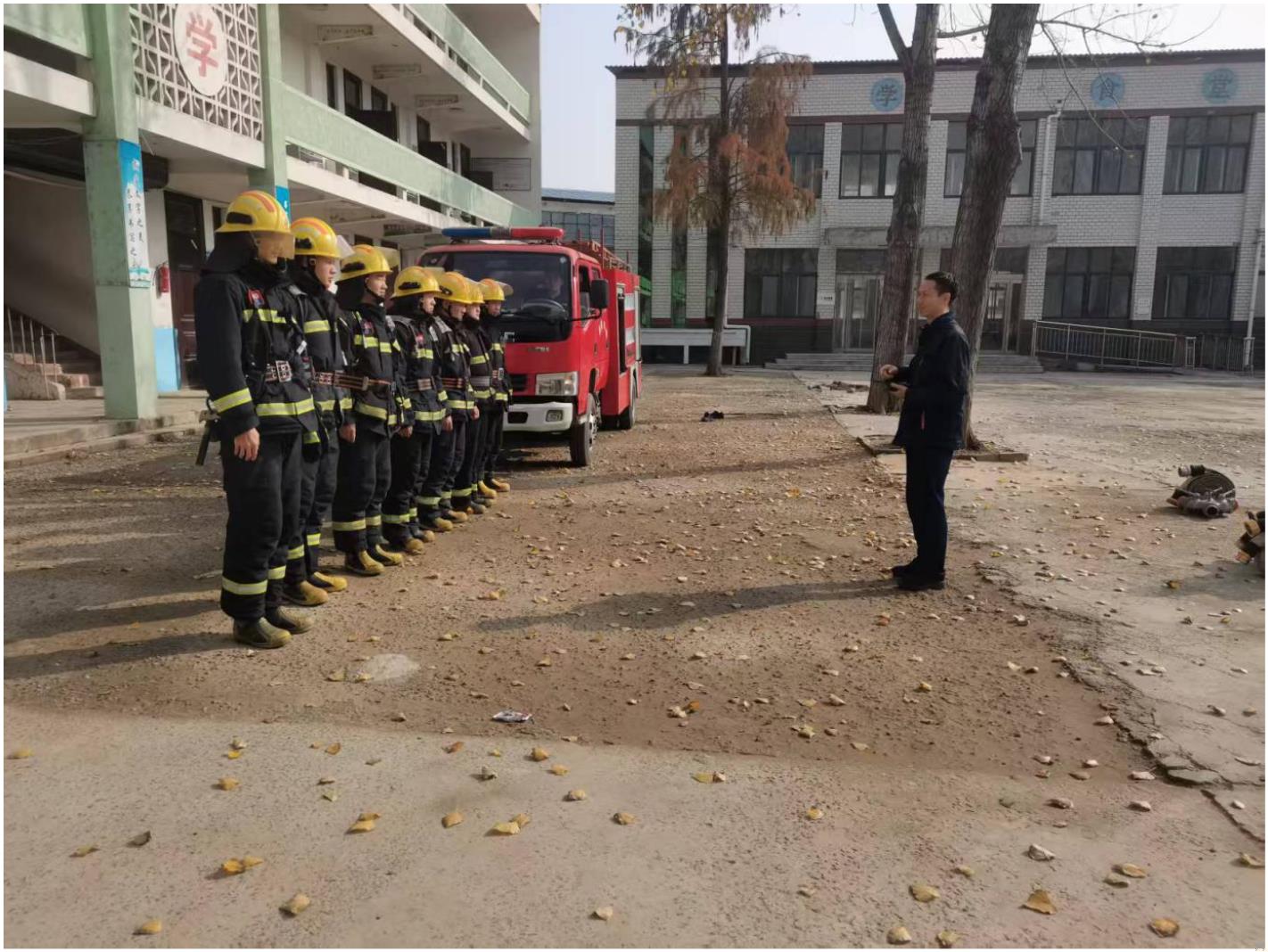 祥符区消防大队调配的 1 辆消防车准时抵达我校宿舍楼前,消防队员们活动组织严密、流程规范、重点突出,取得了良好的预期效果。