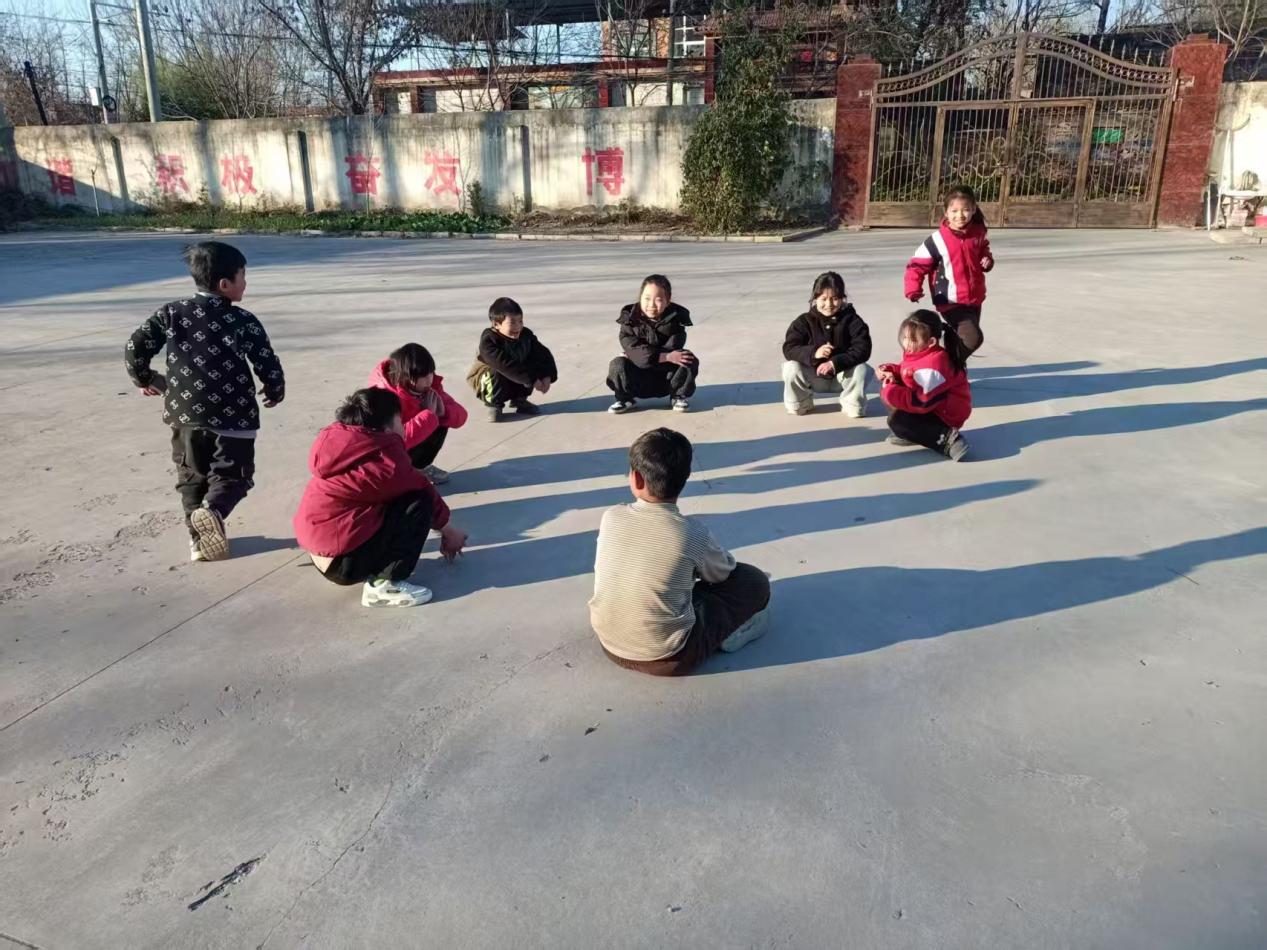在操场的另一边,丢手绢游戏开始了,孩子们围成一个大圆圈,坐在地上。一个同学拿着手绢,悄悄绕着圈走,大家唱着儿歌,眼睛紧紧盯着,生怕手绢落在自己身后。当手绢被放下时,紧张又刺激的追逐就开始了。大家一边转动身体,一边唱着简单的歌谣,脸上洋溢着轻松的笑容,彼此的互动让游戏充满了童真与乐趣。