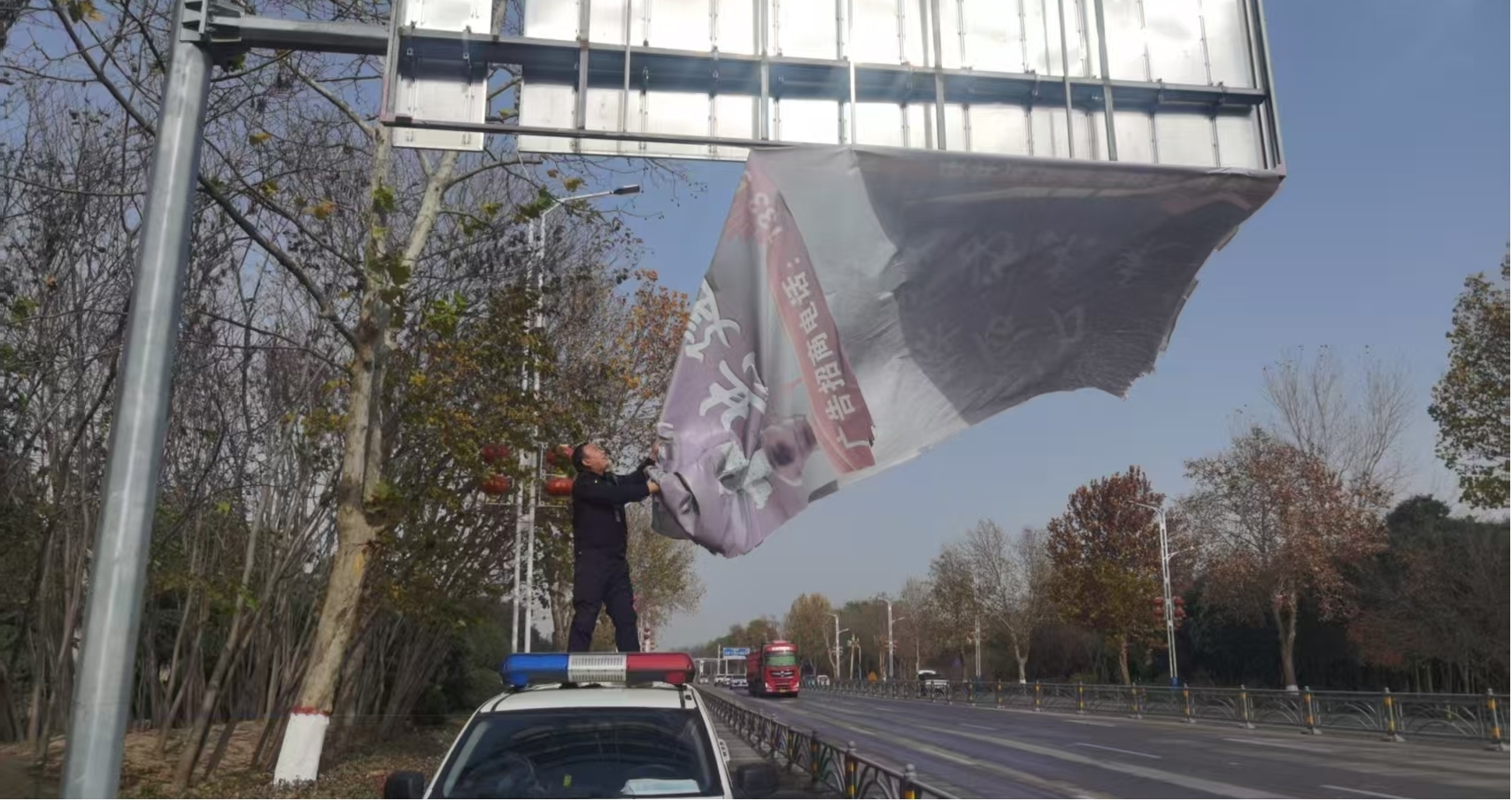 一日,通许县城管局的执法队员在日常巡检时,一眼盯上了迎宾大道上方那块 “耷拉着脑袋” 的大型招牌 —— 原本紧绷的布面已经撕裂大半,半幅材料悬在车道上方,被风吹得 “哗哗” 作响,过往车辆只能减速绕行。