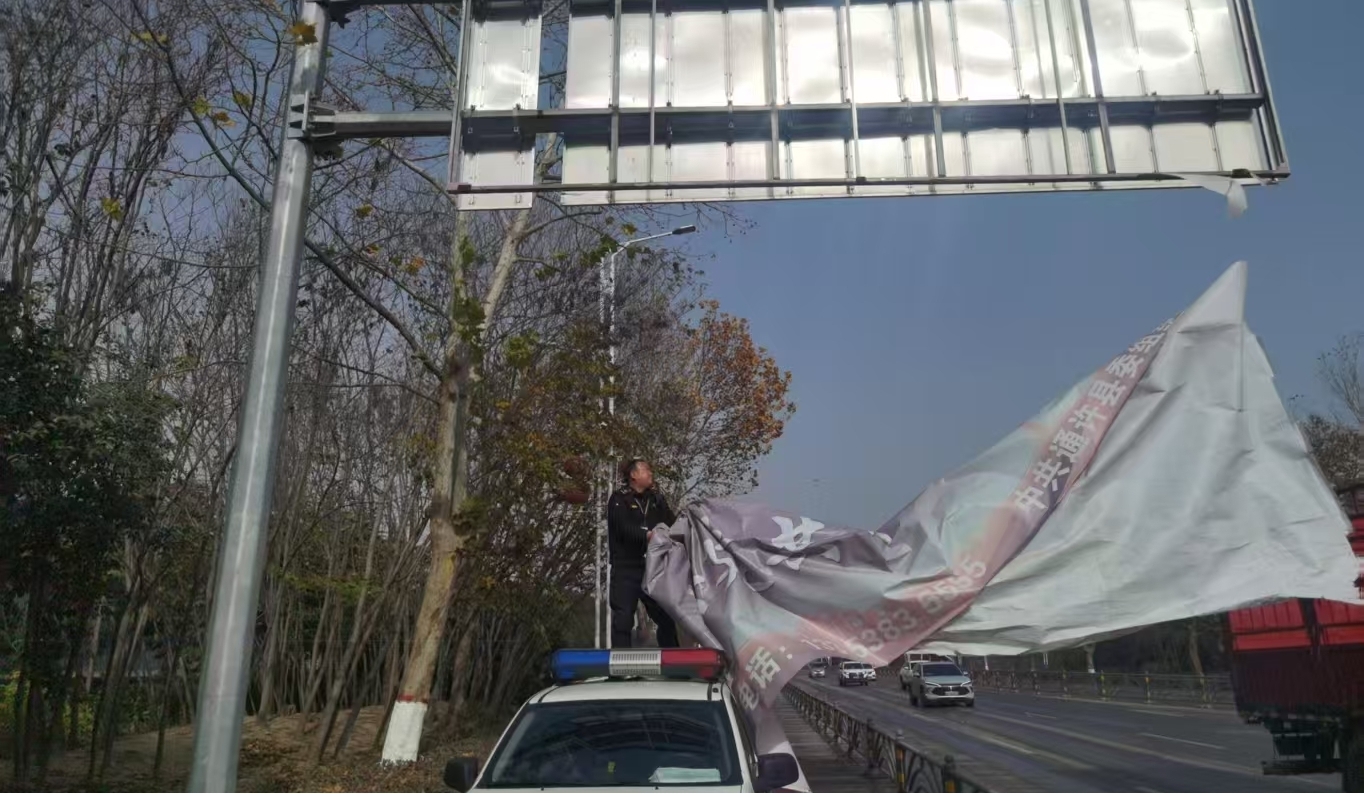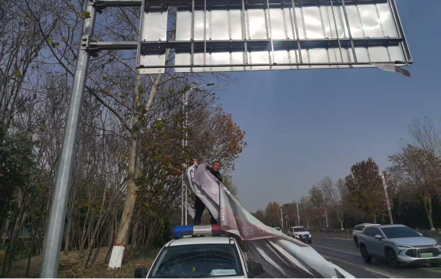 没等专业登高设备到场,执法队员直接踩上执法车的车顶,借用招牌拆除长杆够到悬垂的布幔。他拽住布面边缘,顺着撕裂的缝隙一点点将破损材料从固定卡扣上扯下;地面的同事则拉紧布幔下端,避免它突然扫到路过的车辆。几分钟后,这块近 10 米长的破损布面被安全拖到地面,路面随即恢复了通畅。