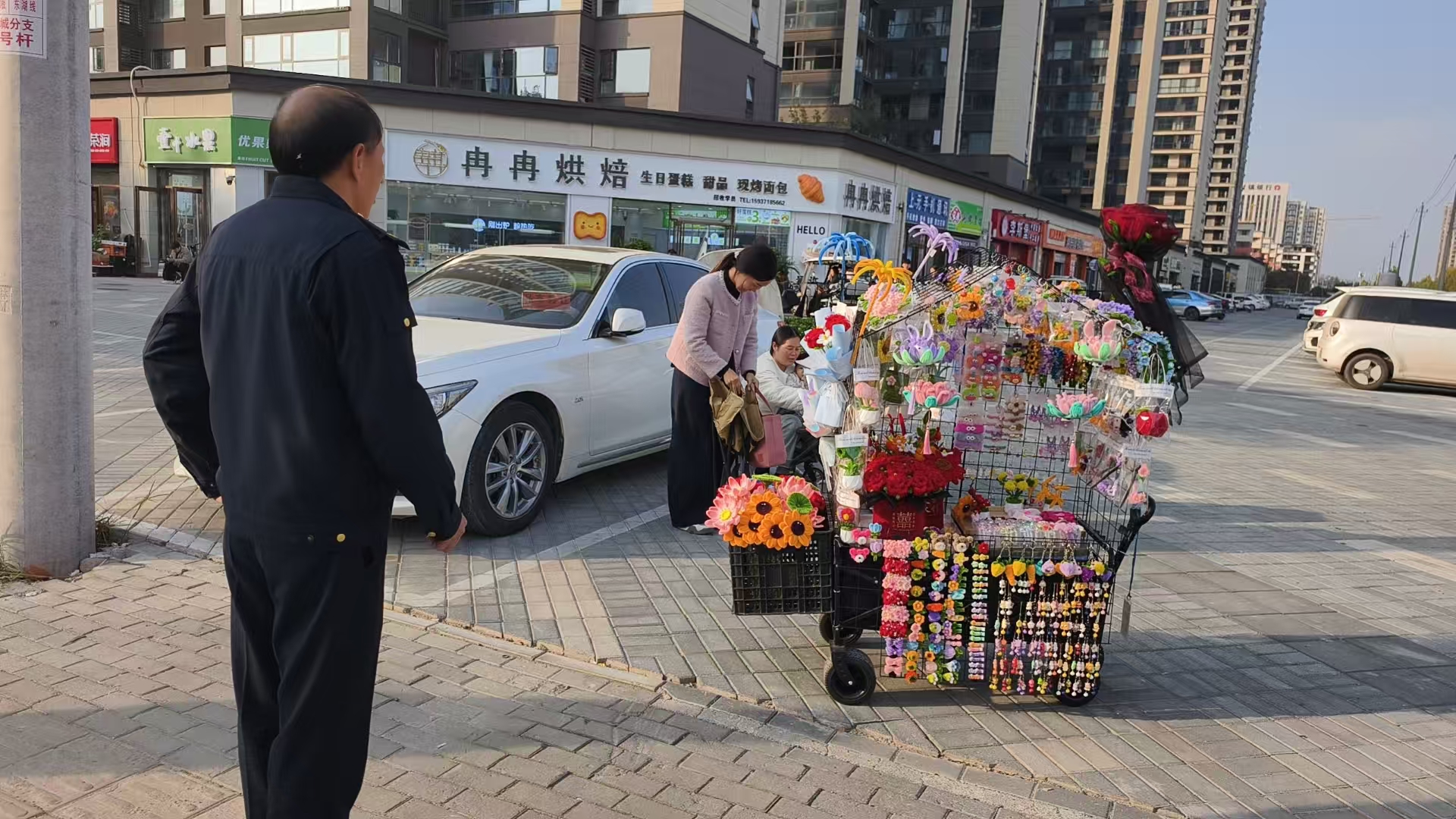在第一张照片里,三轮车旁的摊主刚装好一袋香蕉,城管局的执法队员并未上前阻拦,而是站在一旁等交易结束后再引导;第二张图中的手工花摊旁,执法队员静静等候顾客挑完饰品,再和摊主商量摊位的合规摆放区域。这些细节,藏着城市治理的 “温度”—— 既守住公共空间的秩序底线,也护住小商贩的生计暖意。