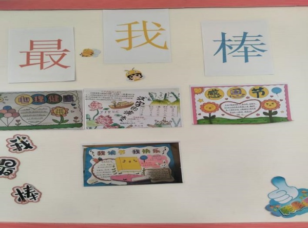 四年级这些设计独具匠心,主题鲜明突出, 画面布局合理,图文并茂,色彩搭配和谐,或热烈奔放,或淡雅清新。每一位孩子都有自己与众不同的色彩,如同七色花一样,独特而明媚。一个个“小画家”、“小书法家”,将巧思注入笔端,将慧心注入脑海,构成了一处处生动、和谐的班级角落。