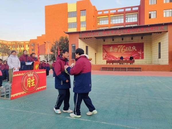 对抗赛在操场的旌旗猎猎中正式拉开序幕。胜方班长与班主任并肩登台,话语里是藏不住的笑意与对班级团结的肯定;负方阵营的班长昂首而立,语气里满是不服输的锐气。台上台下的呼应里,胜负的界限渐渐模糊,只剩少年意气与师生温情交织成最生动的画面。