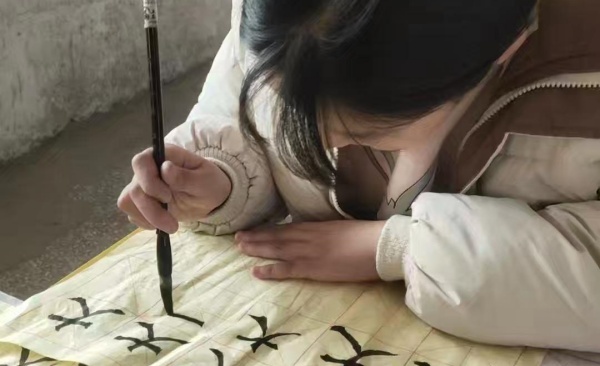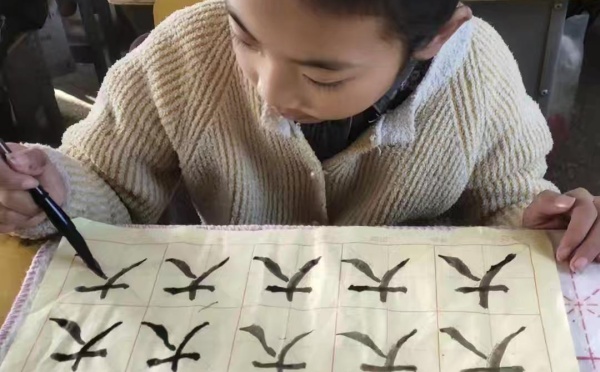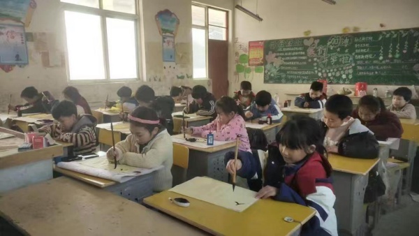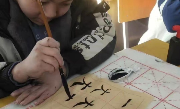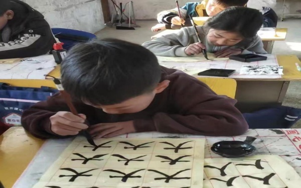 阳光透过明亮的窗户,在教室的地板上织就斑驳的光影。整齐排列的课桌上,砚台与毛毡静静相依,数十支毛笔如待发的竹箭,排列在桌上。孩子们挺直脊背,右手握笔如执圭臬,左手轻按宣纸边缘,指节因专注微微泛白。