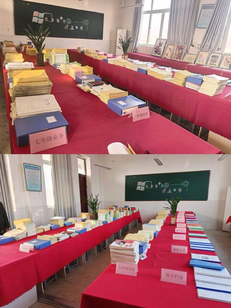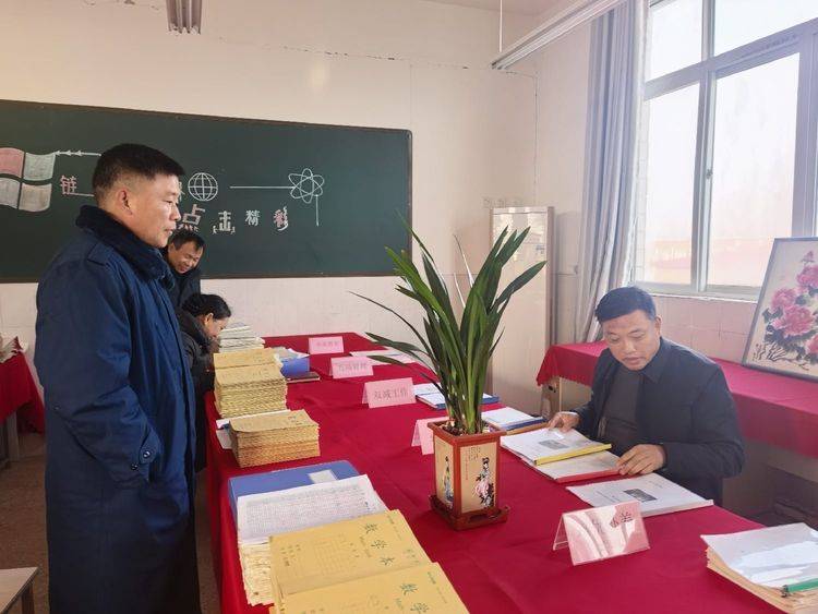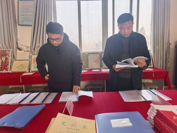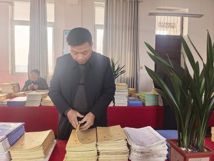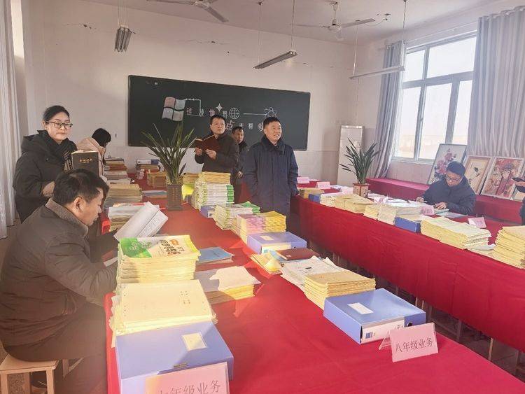 检查现场,领导们分工明确、组织有序,检查有条不紊地展开。分别对教师备课、听课记录、读书笔记、试卷分析、课堂作业等业务等进行了细致检查,详实记录各项材料中的亮点与不足汇总分析,并给出指导性建议。