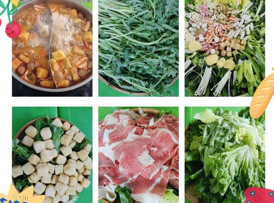 紧接着,本次活动的“主角”——火锅食材闪亮登场。老师将洗切好的食材分好类摆在桌上,绿油油的菠菜、黄澄澄的玉米、圆滚滚的丸子、嫩滑的豆腐、Q弹的面条……五颜六色的食材瞬间吸引了孩子们的目光。老师耐心讲解每一种食材的名称和营养价值:“菠菜富含维生素,多吃能长高;豆腐软软的,吃了对肠胃好。”还不忘叮嘱大家,煮火锅时要等食材熟透才能吃,既满足了孩子们的好奇心,又传递了健康饮食的知识。