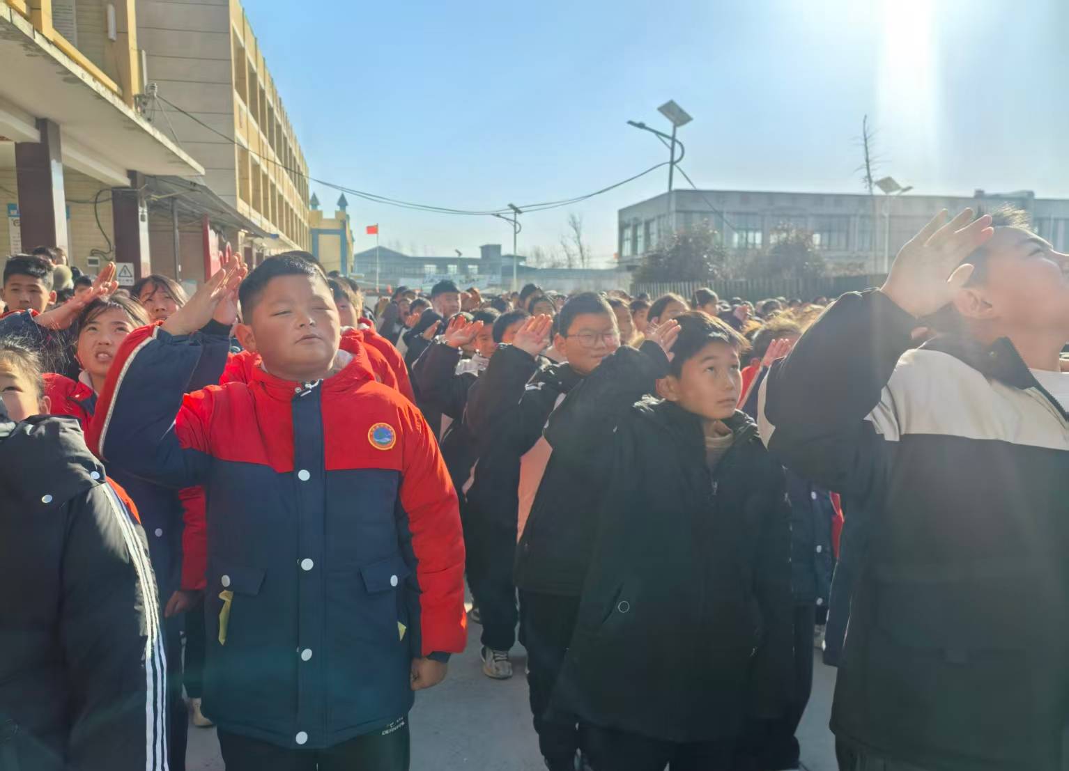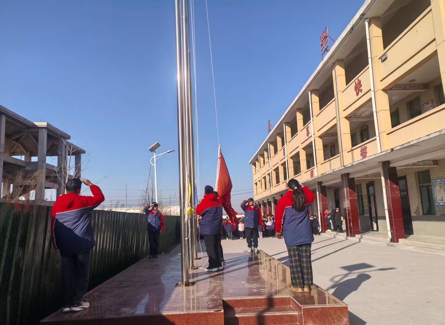 伴随着雄壮的《义勇军进行曲》,鲜艳的五星红旗冉冉升起,全体师生肃立行注目礼,嘹亮的歌声在校园上空回荡,爱国情怀与奋斗之志在每个人心中激荡。