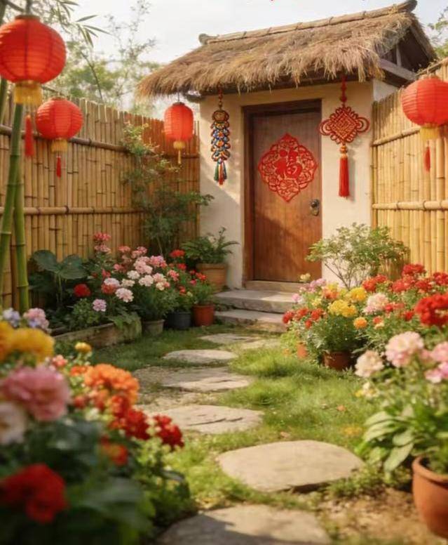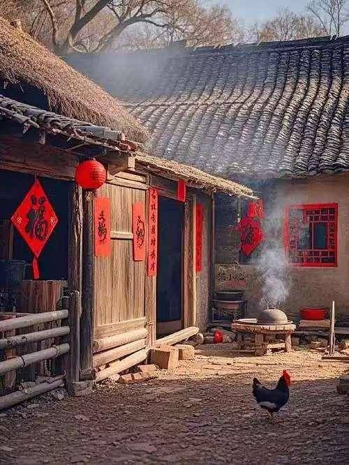 红色的晚霞映衬着山村屋场一排排的红灯笼和红对联。几十户人家的小山村,每户门前高挂的烛光红灯笼在摇曳,散发出柔和而温暖的光芒,仿佛在诉说着家的温馨与安宁。无论是远方的游子,还是归家的旅人,只要望见那熟悉的红灯笼,心中便会涌起一股莫名的感动与亲切。