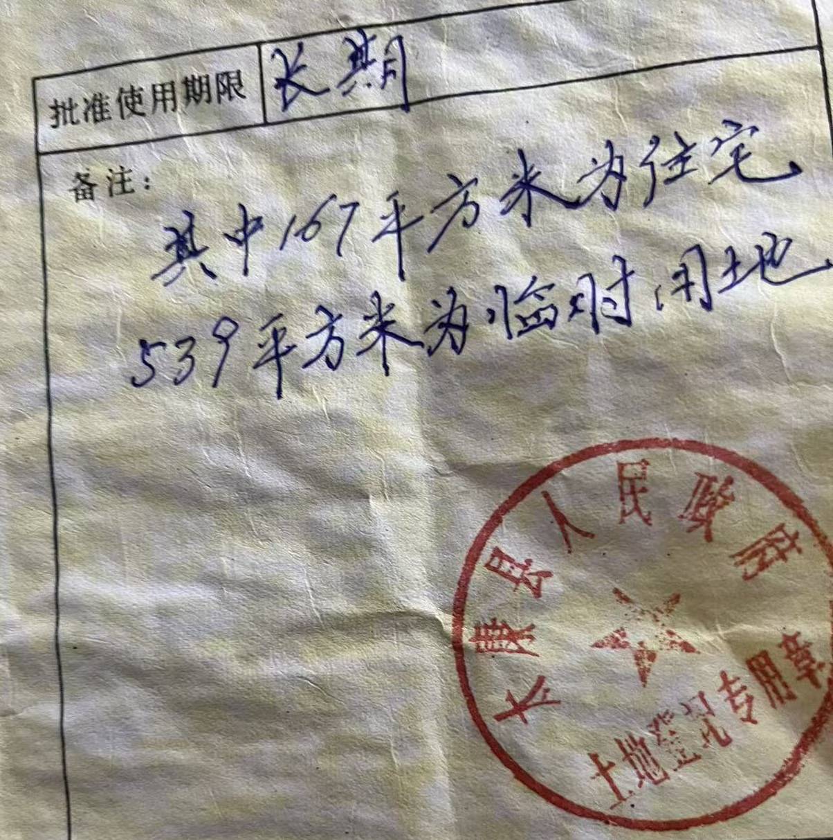 (2025)豫1627民初8094号案件中,原告李之运持有的王集集建(91)字第6972号集体土地建设用地使用证,堪称“太康最牛土地证”。证件载明总面积706平方米,其中住宅167平方米、临时用地539平方米,远超河南省平原地区一户宅基地的法定上限,公然突破国家农村宅基地管理的硬性红线。