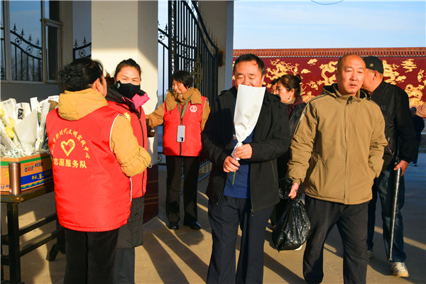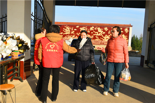 跟车执勤志愿者给顾客发放文明祭祀宣传册
