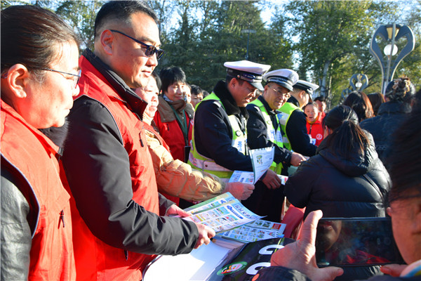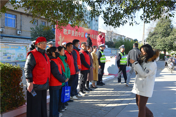 大家首先在市委礼堂前给过往行人发放交通安全宣传单及礼品盒、抽纸等。同时,军乐鼓队献上了一场精彩纷呈的表演,吸引了众多的过往行人驻足观看和领取交通安全宣传单,观看了交通安全宣传板报。将“一盔一带”、“不闯红灯”、“拒绝酒驾”等交通安全知识以更加生动、有趣的形式深入人心。以通俗易懂的方式传递了文明出行理念,让新时代文明实践工作更接地气、更有实效。