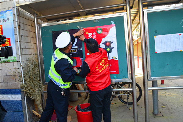 侯马市交通管理大队宣传科科长郭峰跟志愿者一起在侯马二中粘贴宣传海报