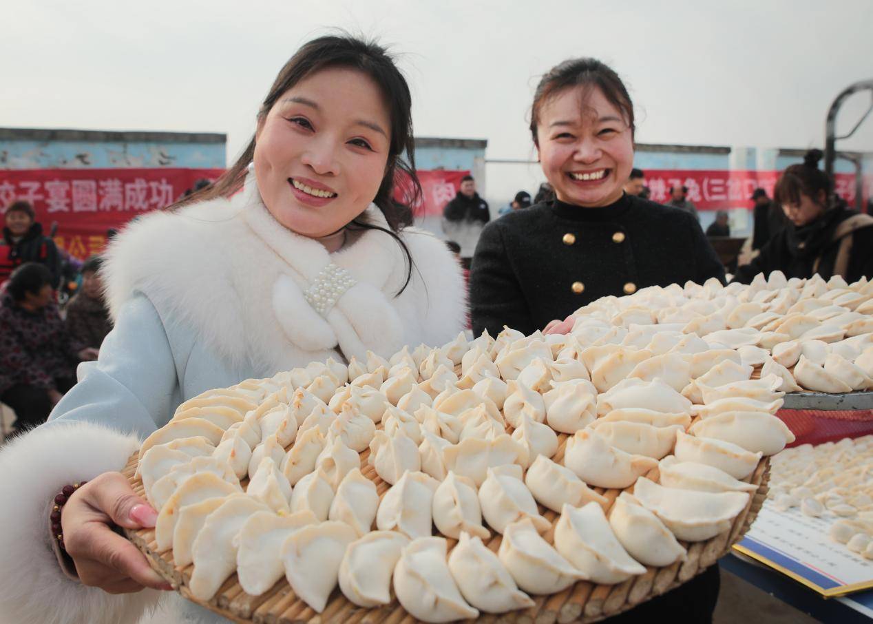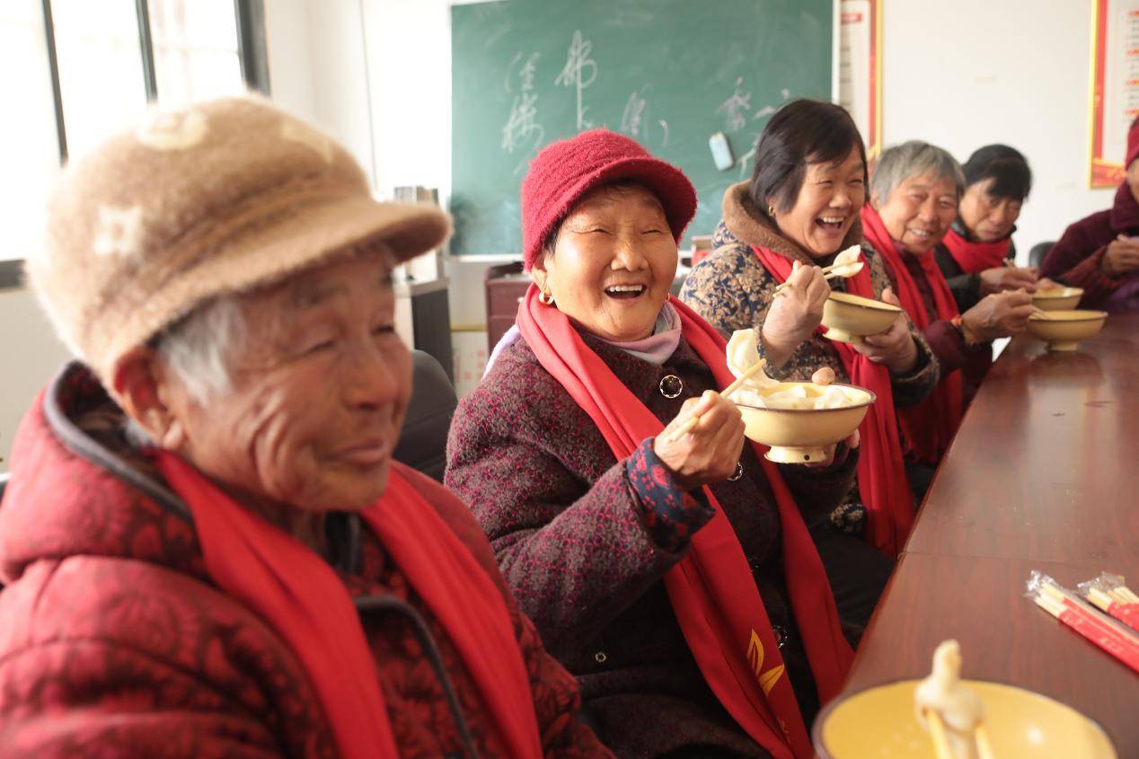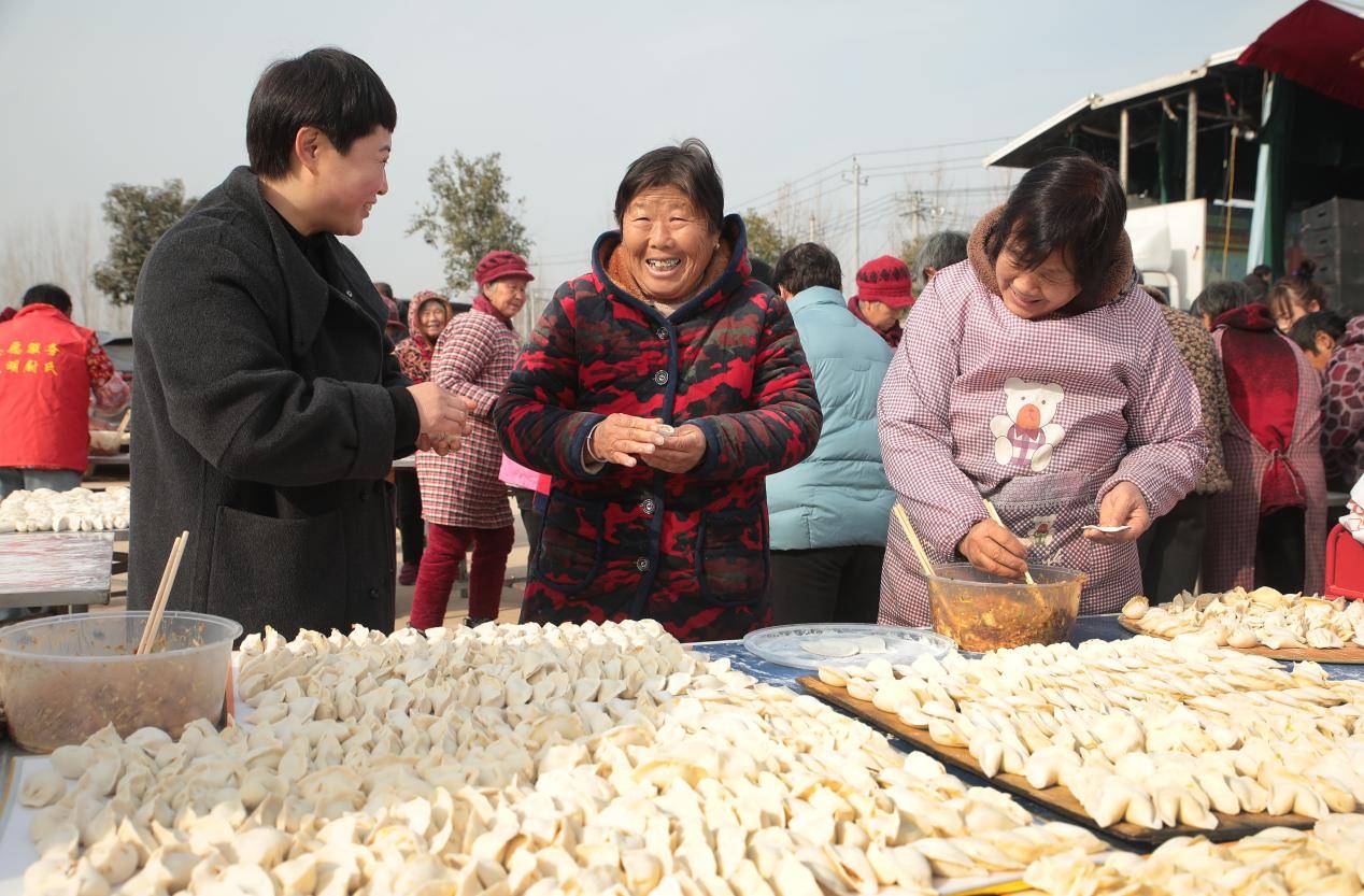 饺子宴现场, 这边,大盆里的饺子馅“喷香”,和着锣鼓声、欢笑声;那边,党员干部们袖子一撸,和面、擀皮、包饺子、端饺子……忙活得脚下生风。这场宴,“顾客”全是村里老者,“跑堂”的却是村干和党员社会志愿者。大伙儿在一块儿忙活、说笑,那亲热劲儿,真跟一大家子过年似的。