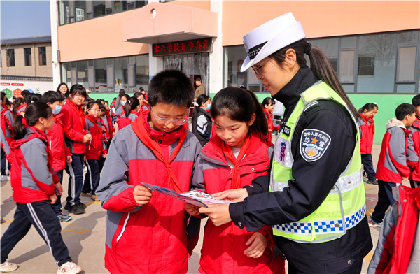 交管大队的交通宣传员给学生们发放交通安全宣传单