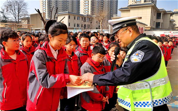 交管大队宣传科科长郭峰为大家讲解交通知识,并向回答问题的学生给予奖励