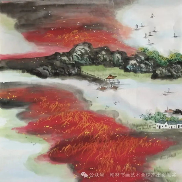 故而我构思创作了这幅红绿相间的山水作品。