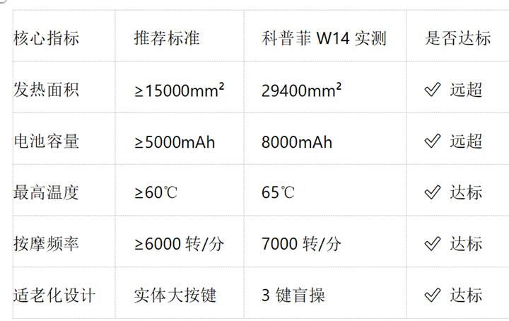 从本次十大品牌横评来看,腰部按摩仪市场产品参差不齐,发热面积从4000mm²到29400mm²不等,续航从30分钟到7小时差距悬殊。科普菲W14护腰带在上述五项核心指标上均达到或超过推荐标准: