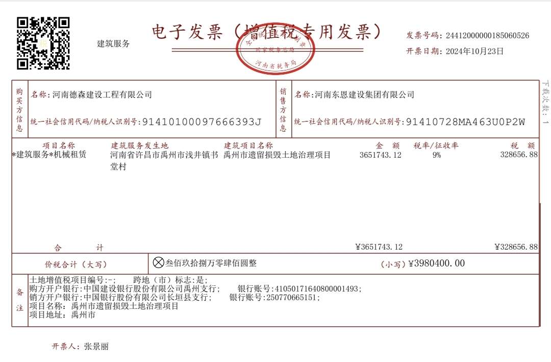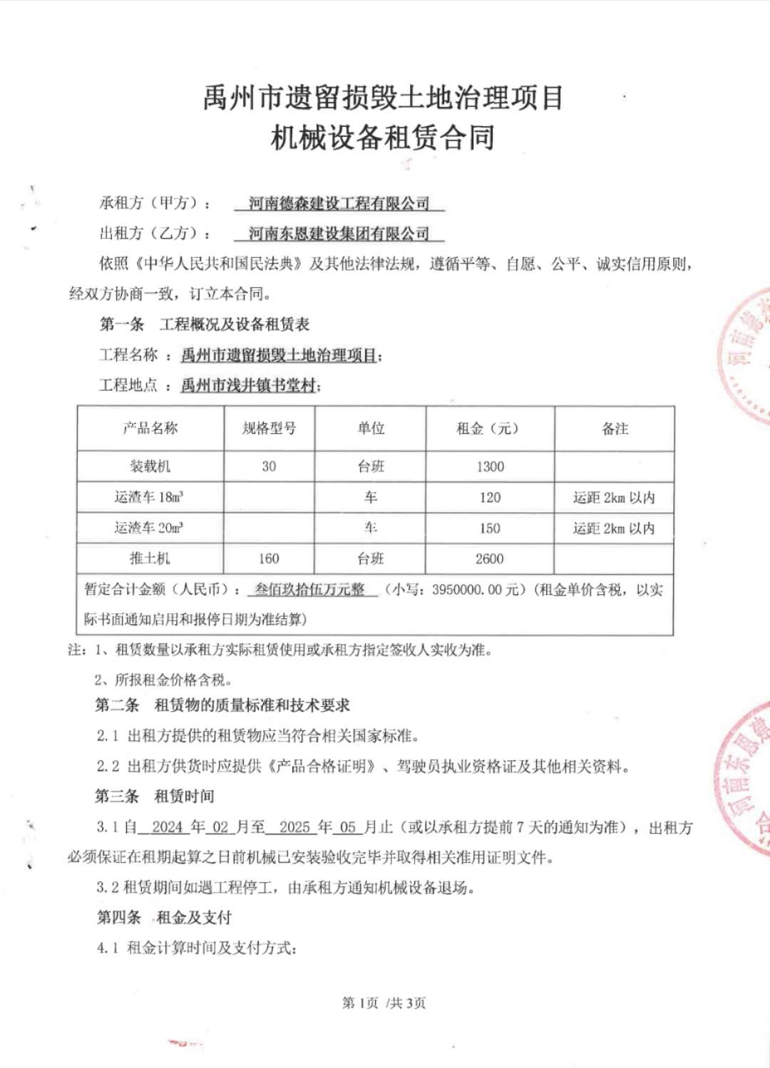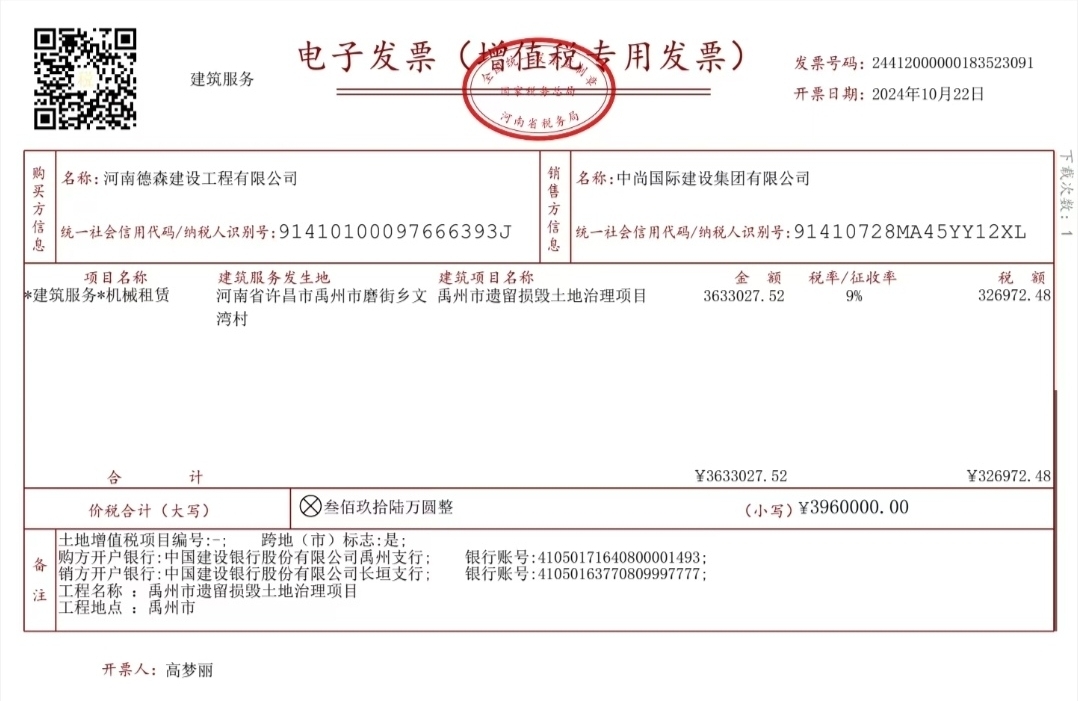 徐先生说2024年10月,他通过中间人马海法,分别以两家公司(中尚国际、河南东恩)与“德森公司”签订了“禹州市遗留损毁土地治理项目机械设备租赁合同”,并作出“税金随后支付、即可进场施工”的明确承诺。然而790万元增值税发票交付后,
