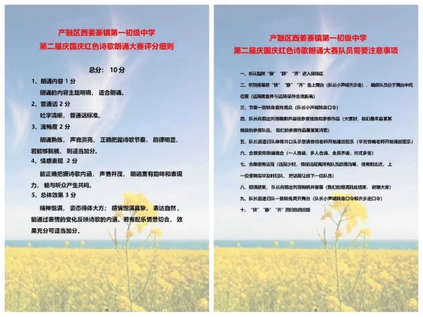 随后,主持人介绍评委,并邀请仇正华老师宣读评分细则。“本次比赛将从朗诵内容、语言表达、情感饱满度、流畅度、总体效果五个维度评分,满分10分,去掉一个最高分和一个最低分后取平均值,确保公平公正。”仇老师条理清晰地讲解着,台下师生认真聆听,为比赛的顺利进行筑牢了规则基础。