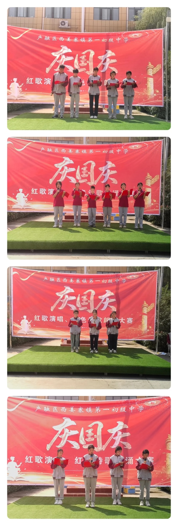 “代表全体参赛队员宣誓:遵守比赛规则,尊重评委裁决,以最饱满的热情投入比赛,用最真挚的情感歌颂祖国,展现西姜寨一中学子的风采!”参赛队员代表站在台前,举起右拳庄严宣誓,稚嫩而坚定的声音回荡在校园,彰显着少年们对比赛的郑重与对祖国的深情。