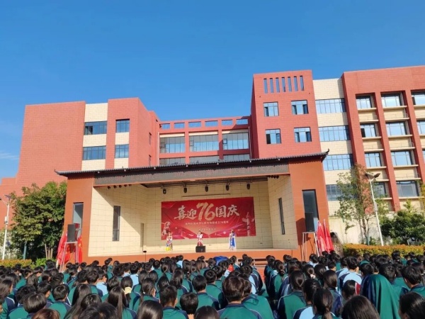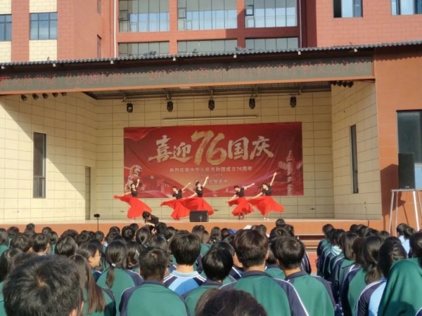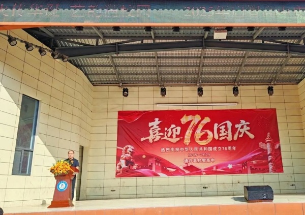 启智高中副校长贺书阁在致辞中祝福祖国76周年华诞,强调国家繁荣与教育发展密不可分,回顾学校在党建引领下的办学成果。他号召教师坚守教育初心,勉励学生勤奋学习、锤炼品格,为民族复兴贡献力量。通过文艺汇演激发师生爱国热情,共同祝愿祖国繁荣昌盛。