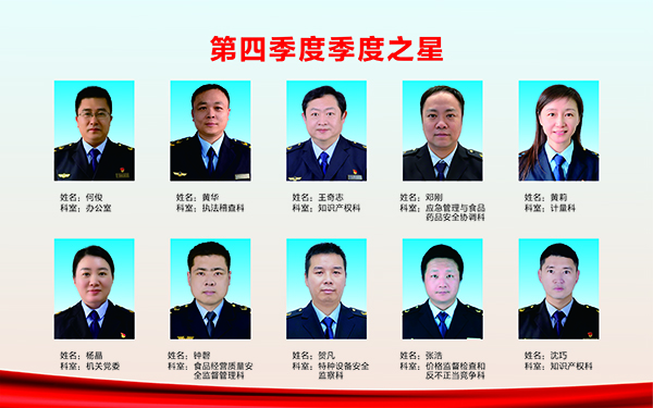 每季度评选10名季度之星,其中科室负责人评选5名、一般干部评选5名。每季度评选结果在局机关公示栏展示。