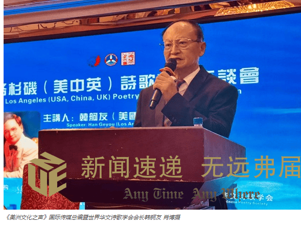 《美洲文化之声》国际传媒总编暨世界华文诗歌学会会长韩舸友,其笔名为寒山,是海外诗人,有《情殇》和中英文诗集《流浪的月光》等诗歌敬文集。他表示:“这是一场以英国和中国的三位诗人为主讲的讲座,同时我们也邀请到了南加州作家协会的会长、秘书长齐聚一堂,来自洛杉矶各大高校的文学教授,以及知名作家、诗人都参与其中,可以说是南加州文学界的一次盛会。期待通过这次交流,能够进一步团结南加州的文学朋友们,共同探讨与传承中华优秀传统文化。更重要的是,通过诗歌这一桥梁,让我们的声音走向世界,让世界的诗歌融入我们的文学之旅。虽然我本人并不是严格意义上的专业文学工作者,但在过去十余年中,我一直希望通过创业与写作,为大家带来一种不同的诗歌写作方式。